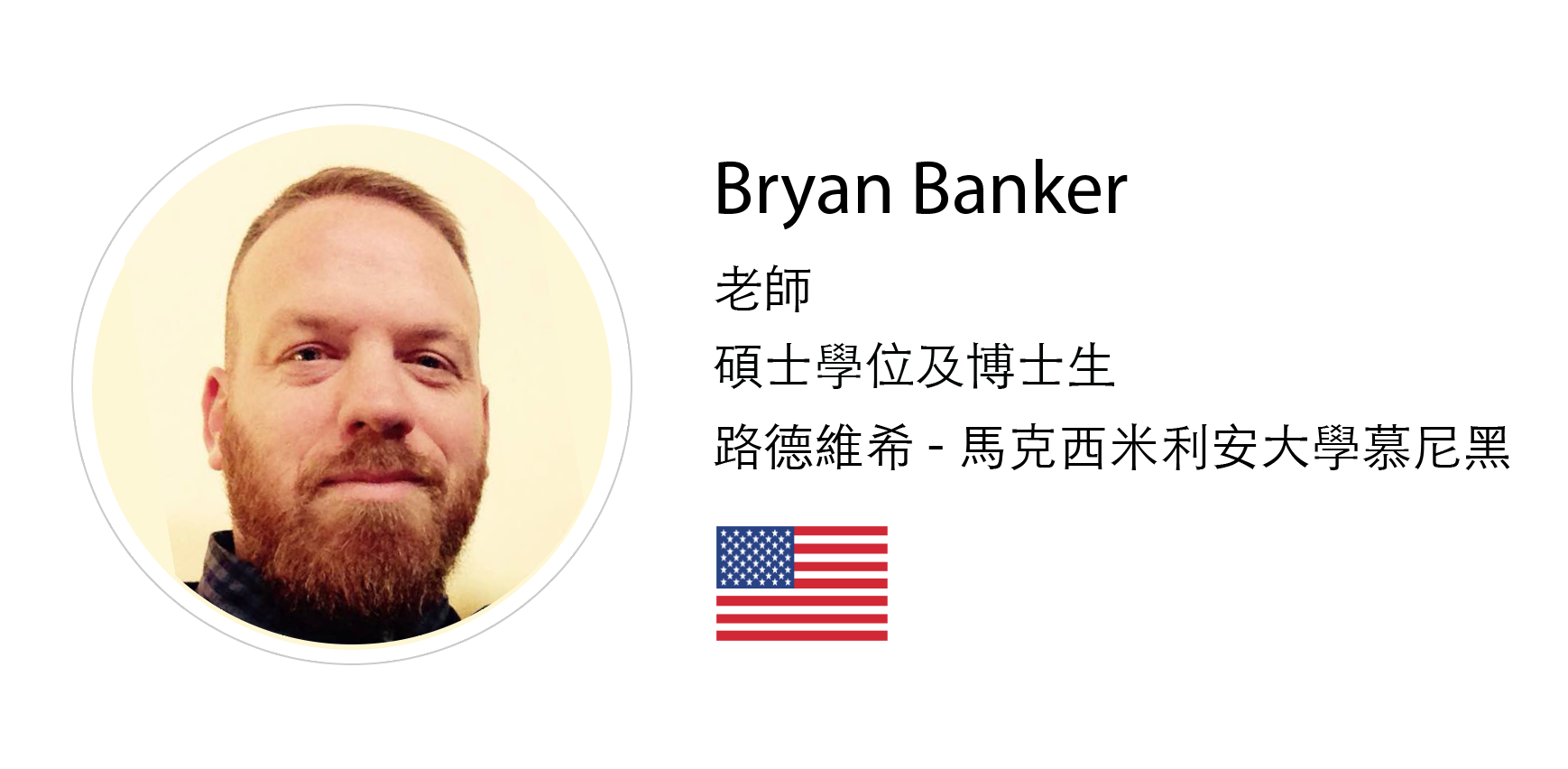 Bryan Banker來自美國,是一位就讀於慕尼黑大學的博士生,他擁有海德堡大學碩士學位,以及西敏寺學院學士學位。Banker先生曾接受邀請出席多個位於不同國家的學術研討會,並同時到訪過英國﹑菲律賓﹑意大利﹑墨西哥﹑瑞士﹑德國﹑荷蘭﹑丹麥﹑瑞典﹑法國及西班牙等三十多個國家。Banker先生對世界各地的文化都有一定認識,使他在教授英語時,不但豐富了教學內容,也大大提升了教學趣味。